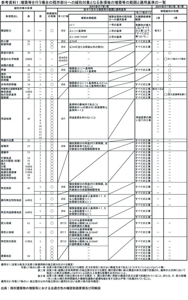 つまり、上記に記載されている条項に該当しない場合は遡求緩和がされないということになり、増築時に既存不適格部分について改修工事を行う必要があります。逆に言うと、上記に記載されている条項のなかで政令の定める条件を満たす場合は遡求緩和が可能になり、既存不適格建築物の状態を維持することができます。緩和条件については“建築基準法施工令 第八章 既存の建築物に対する制限の緩和等”に記載されている内容を参照することで確認できます。